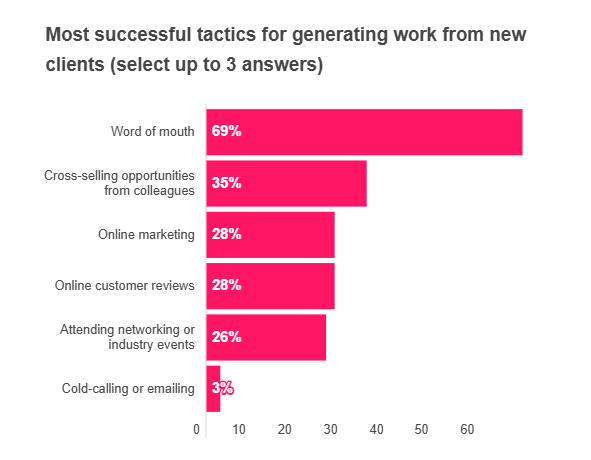 Word of mouth remains the most successful way to generate new work, with 69% of firms reporting success through this channel. To address this challenge, many firms are increasing their investment in marketing (49%) and business development (43%) to explore new lead generation opportunities.