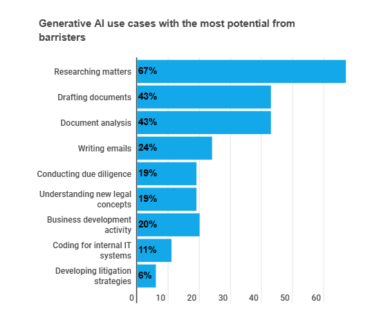 Use cases with most potential: researching matters (67%), drafting documents (43%) and document analysis (43%).