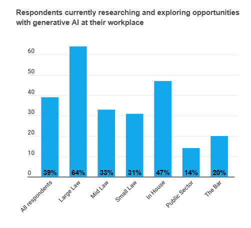 20% said their workplace is researching and exploring opportunities to use generative AI – this rises to 39% when considering responses from all lawyers, and to 64% when looking at responses from large law firms .