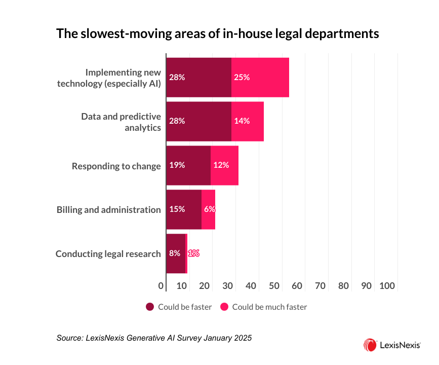 Our survey found only 14% of in-house lawyers said their legal team is fast or very fast at implementing new technology, especially AI. Instead, nearing half (53%) believe their legal team is slow or very slow.