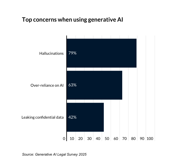 Unsurprisingly, many lawyers expressed concerns about the perceived risks of using AI. Hallucinations were the top concern (79%), followed by leaking confidential data (63%) and individuals becoming too reliant on AI (42%).