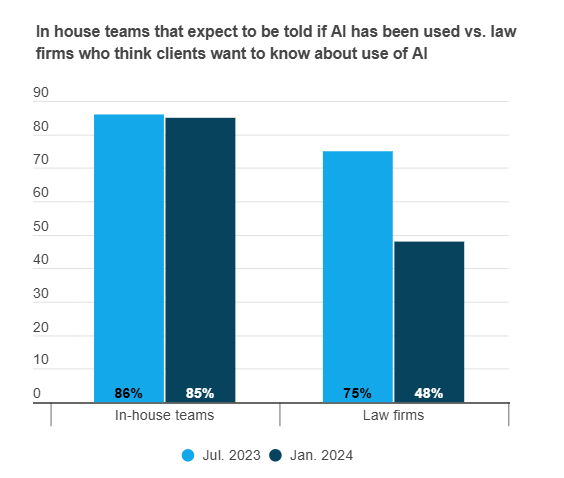 The expectation that law firms inform clients when they're using generative AI is still high, at 85%, compared to 86% in July 2023.