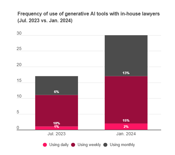 Almost a third (30%) of the corporate in-house lawyers included in this survey revealed they're using generative AI tools at least once a month. This is a noticeable rise from 17% in July 2023.