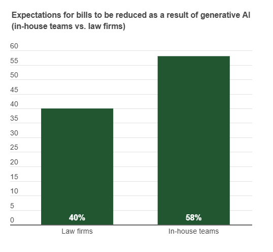 Our survey found 58% of respondents from in-house teams said they will expect bills to be reduced as a result of generative AI. Respondents from law firms, on the other hand, were less likely to agree, with 40% saying they expect bills to be reduced.