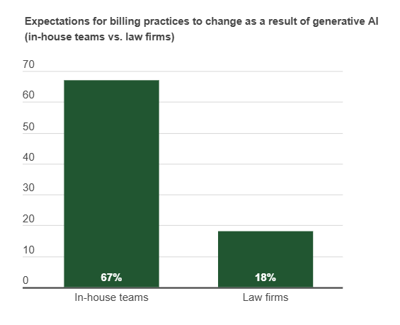 There was a stark contrast in opinion when it came to restructuring pricing as a result of AI. Two-thirds (67%) of in-house legal teams said they expect law firms to make changes to billing practices as a result of generative AI. However, only 18% of law firms said they will make changes to billing practices – despite 42% believing it will reduce overall costs for the firm and 30% believing it will increase hours billed.