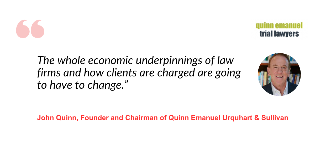 "The whole economic underpinnings of law firms and how clients are charged are going to have to change," says John Quinn from litigation firm Quinn Emanuel Sullivan & Urquart.