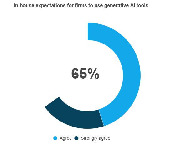 Expectations for firms to use generative AI remains strong, with 65% of in-house counsel now expecting their firms to use AI.