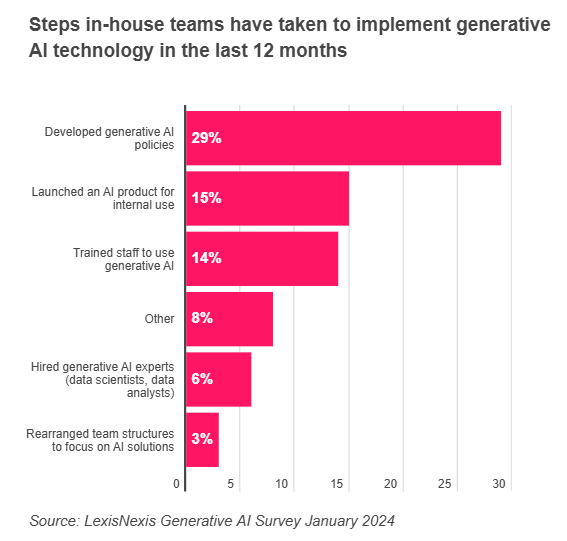 Almost half (47%) of corporate in-house lawyers said their organisation had made a change to their day-to-day operations as a result of generative AI. The most common changes included developing policies on the use of generative AI (29%), launching an AI-powered product for internal use (15%) and carrying out AI-related training for staff (14%).