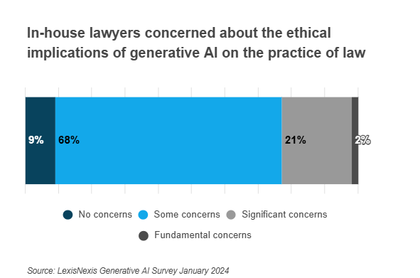 While excitement levels are high, many in-house lawyers still harbour valid concerns over the ethical implications of generative AI. The technology has a tendency to fabricate answers, leak confidential data, and construct biases, posing an obvious challenge for the legal profession.