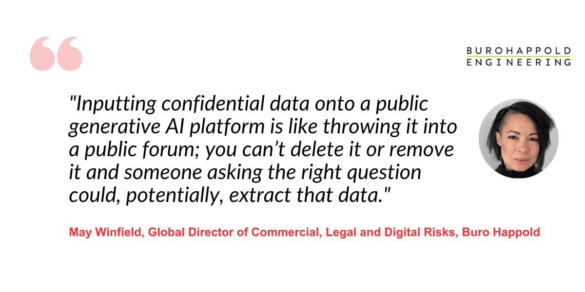 "Generative AI appears to be being embraced in a bigger and faster way than most other technologies in recent history," says May Winfield, Global Director of Commercial, Legal and Digital Risks at internationally renowned engineering advisory firm, Buro Happold.