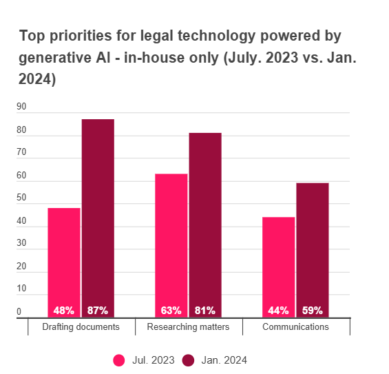 We also asked our in-house respondents how they plan to use generative AI in the immediate future. The biggest priorities were drafting legal documents at 87% (up from 48% in July 2023), and researching legal matters at 81% (up from 63% in July 2023). Relying on generative AI tools to draft emails or other communication-based tasks was also listed as a priority by 59% of respondents (up from 44% in July 2023). So, clearly in-house counsel are increasingly seeing and understanding how generative AI can help them do their work more effectively and efficiently.