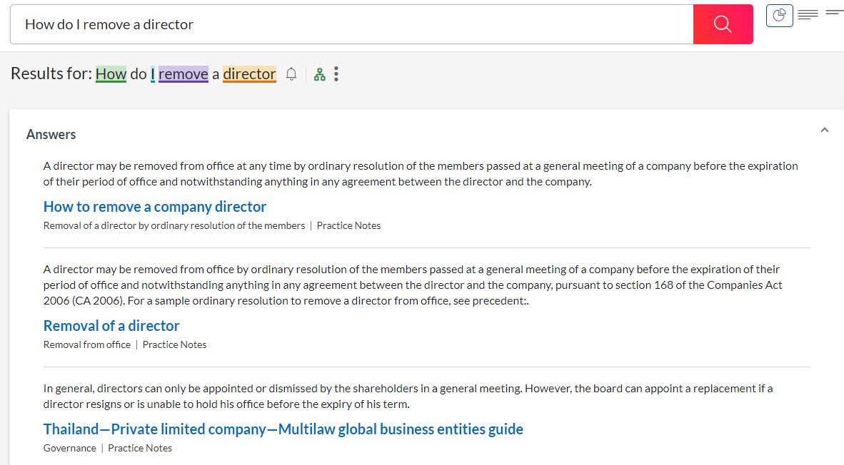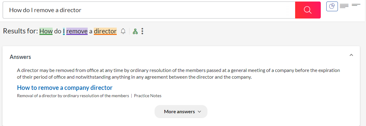 If you search for "How do I remove a director?", Lexis+ UK will present an "Answer Card" containing a direct response to your question.