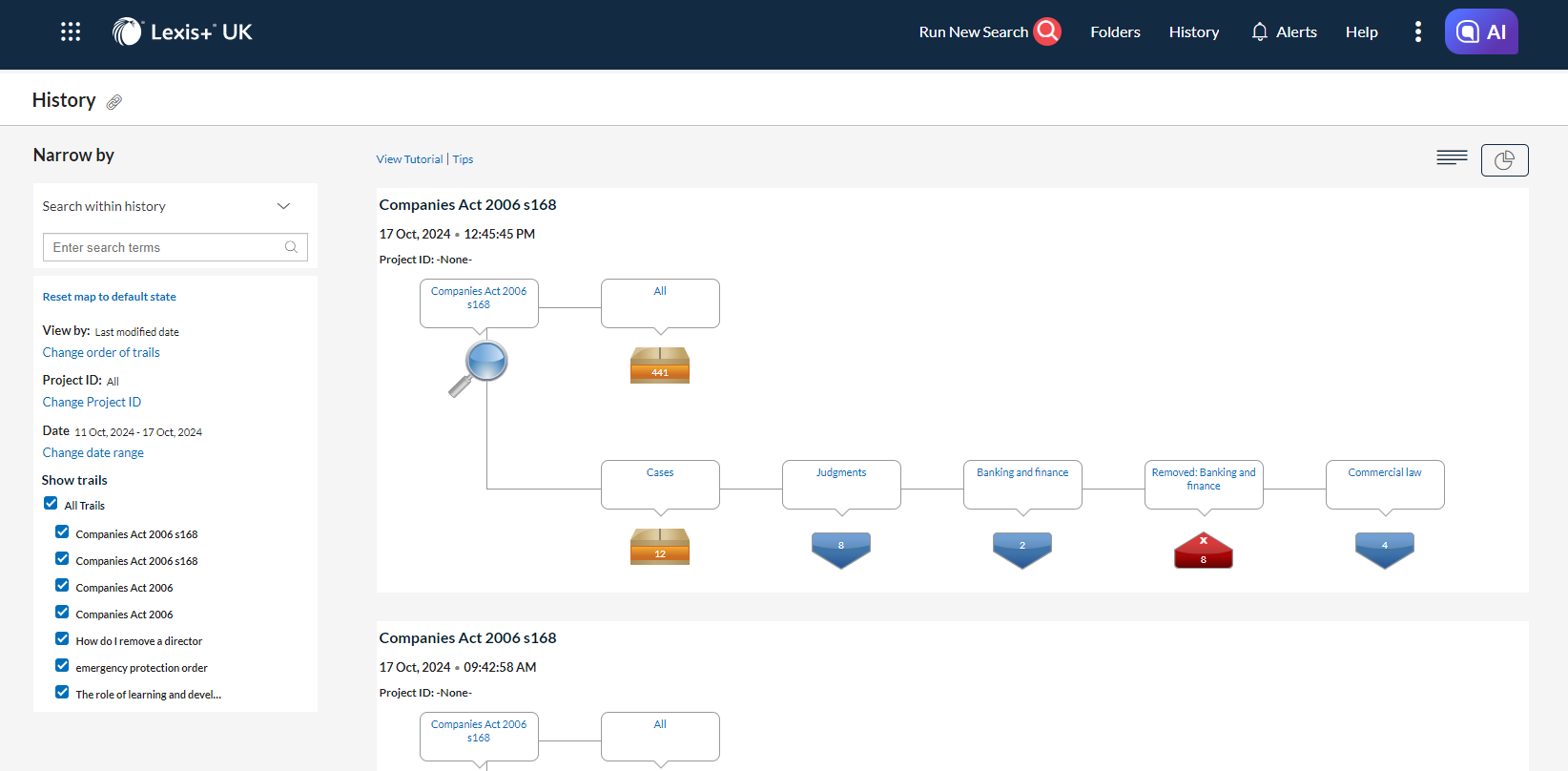 Revisit and rerun your recent searches from the past 90 days. By accessing the History section, you can easily navigate through your search history and quickly re-execute any specific search by clicking on the "Legal Search" option. This feature is particularly useful when you need to pick up where you left off or revisit a previous research topic.