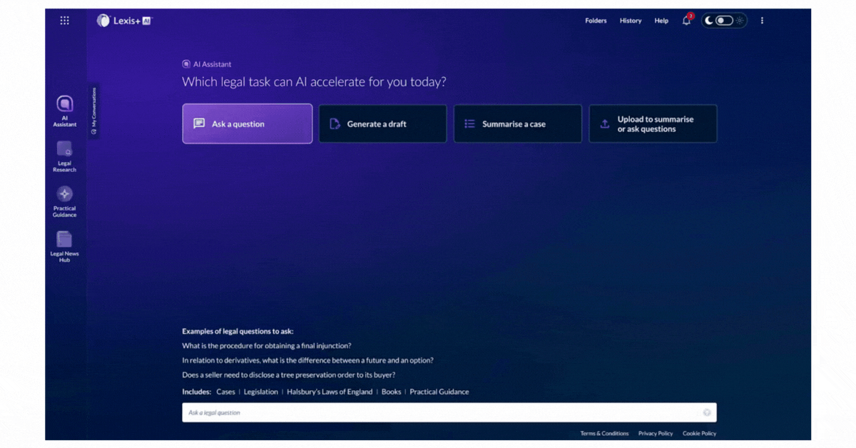 Lexis+ AI provides quick, accurate answers to legal questions, summarises legal documents in seconds, drafts contracts and clauses, and provides deep analysis of your uploaded documents.