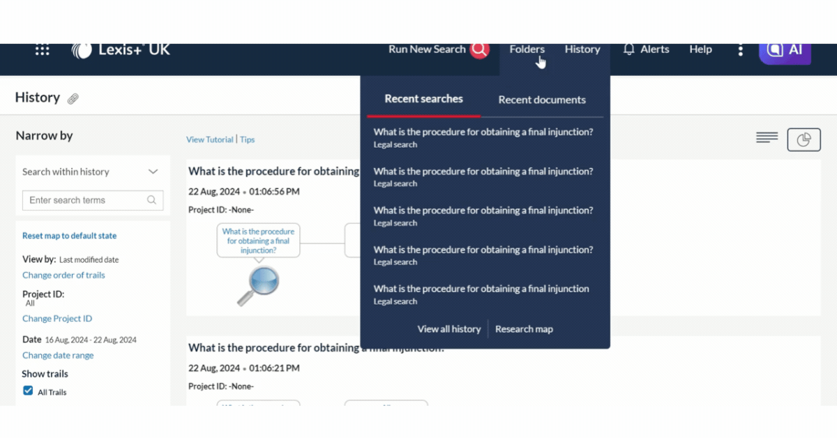 The Research Map on Lexis+ UK is a comprehensive research trail that displays a chronological record of your research activities, including searches, filters applied, documents viewed, and actions taken. This feature can be invaluable for keeping track of your research progress, allowing you to easily revisit previous steps or pick up where you left off, saving you time and effort.